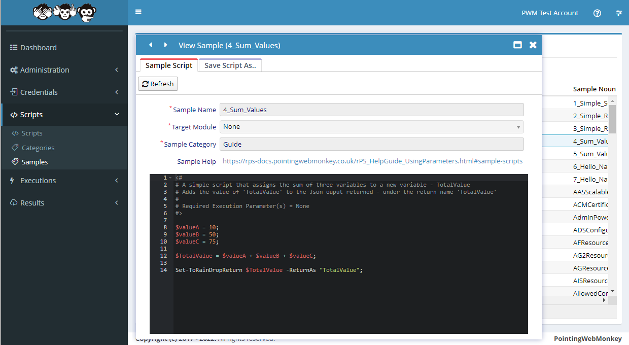 After clicking on a "Sample Script", the "View Sample" window will appear